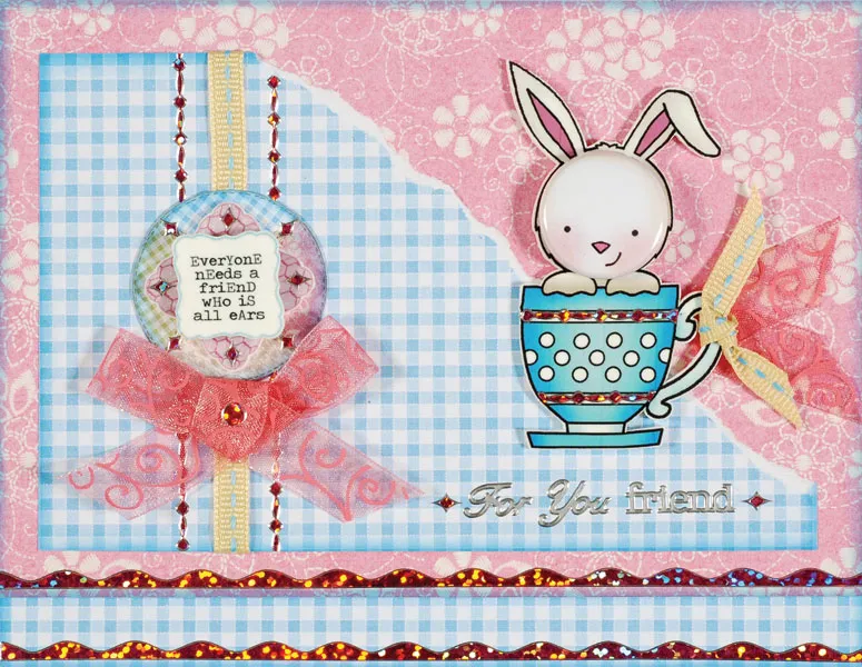 Tie a small knot of ivory ribbon on the teacup handle. Foam tape the piece over the right side of the torn paper edge and Zot the tin pin bunny over the face. Place border Dazzles on the teacup and “For You Friend” Dazzles below it.