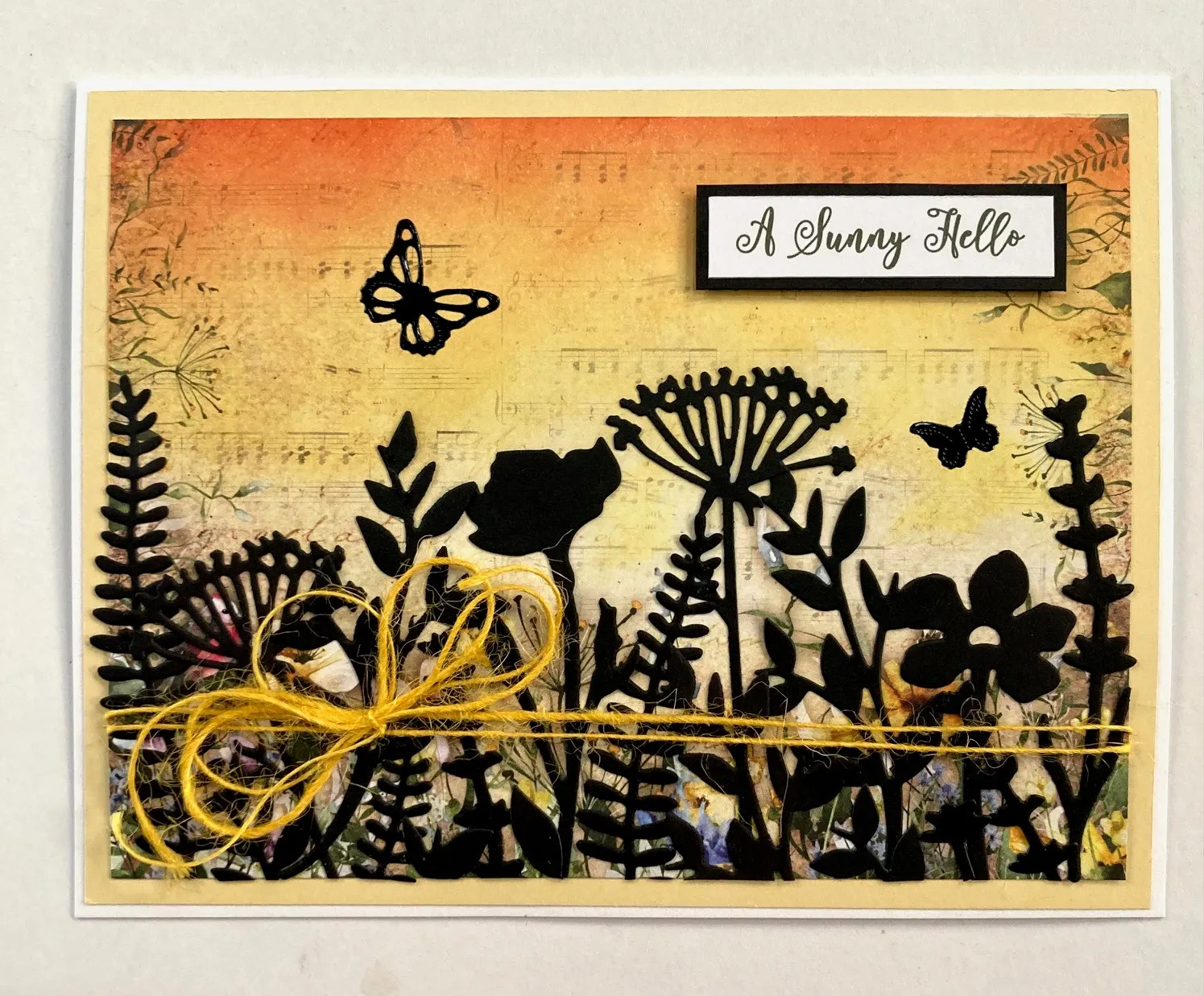 3. Die cut 3-4 each of the Meadow Blooms from black cardstock. Glue them across the border cardstock so they “grow” upward from the lower edge at varying heights. Wrap two strands of yellow jute across the cardstock, ⅞" from the bottom, and glue the ends to the back. Glue the cardstock centered on the card front.