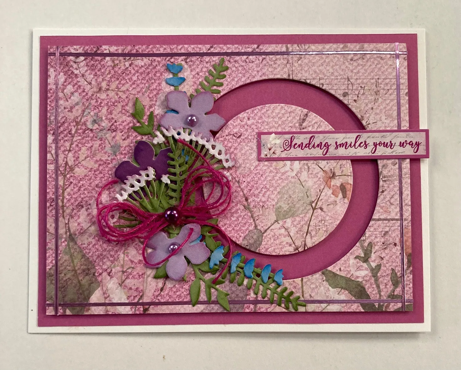 5. Make a 6-loop bow with magenta jute, tying the center with 3" of the same jute. Glue the bow as shown. Place a large pearl in the bow center and medium pearls in the largest flower centers. Glue the “sending smiles…” die-cut to the front as shown.