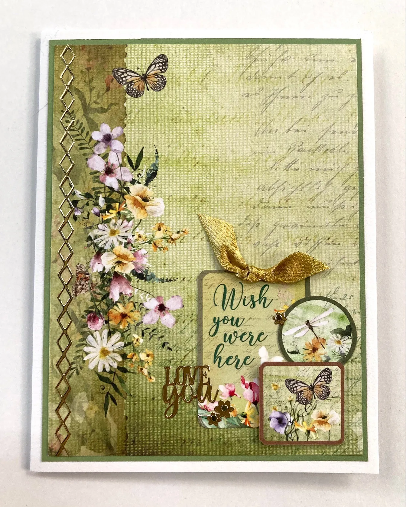 2. Glue the “wish you were here” die-cut and the round cutout at the lower right, then foam tape the butterfly square cutout overlapping both as shown. Place gold “love you” and tiny flower Dazzles™ among them as shown. Decorate the flowers with jewel Dazzles™. Knot 4" of gold satin ribbon, trim the ends, and attach it to the die-cut with sticky tape.
