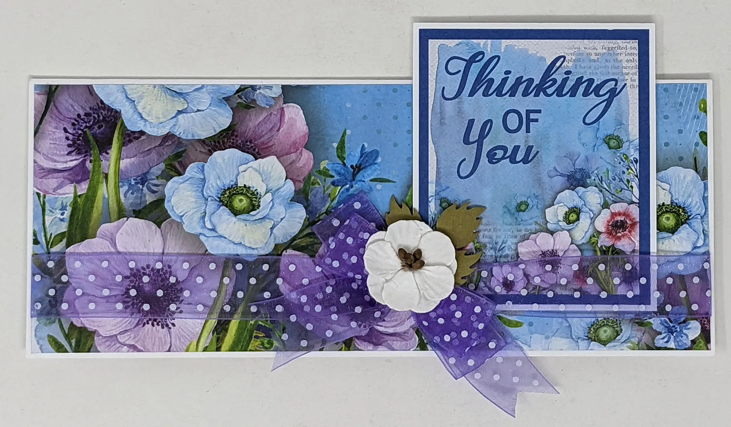 1. For the card front: Place the card with the fold at the top. Cut 8¼"x3¼" Windflowers blue floral cardstock with flowers at the lower left. Wrap sheer dotted ribbon across the cardstock ½" from the bottom and glue the ends to the back. Glue the cardstock centered on the card front.