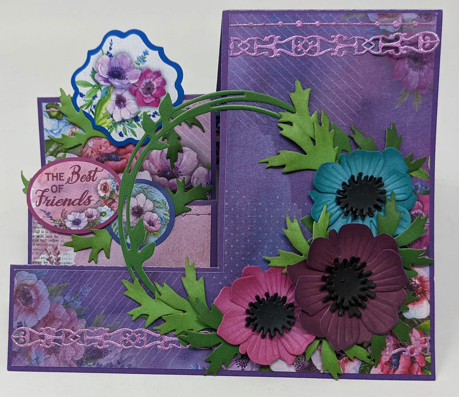 3. Foam tape the Windflowers fancy square die-cut to the back step panel, extending 1⅛" above the fold. Cut out the Windflowers “the best of friends” and small circle labels. Glue the circle and foam tape the oval label to the center step panel, extending above the fold as shown. Die cut two wreaths from dark green cardstock, then glue them together, matching the designs. Glue the wreath to the front as shown.