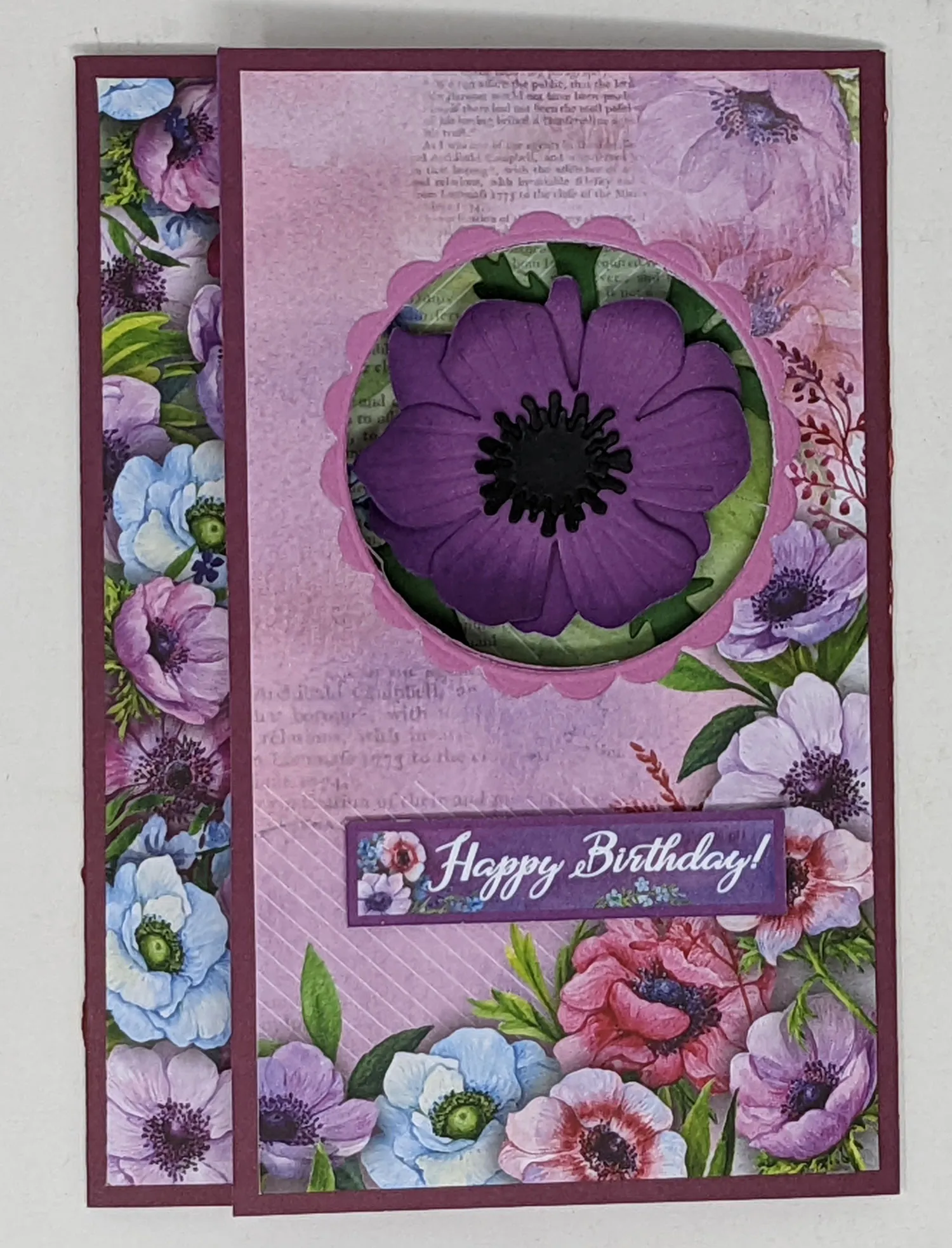 2. Cut out the Windflowers “happy birthday” label and foam tape it below the window as shown. Die cut two frames using the 2¼" circle die and 2½" scallops die, one from dark pink cardstock and one from medium purple cardstock. Glue the pink frame around the window on the card front, then open the panel and glue the purple frame around the window back.
