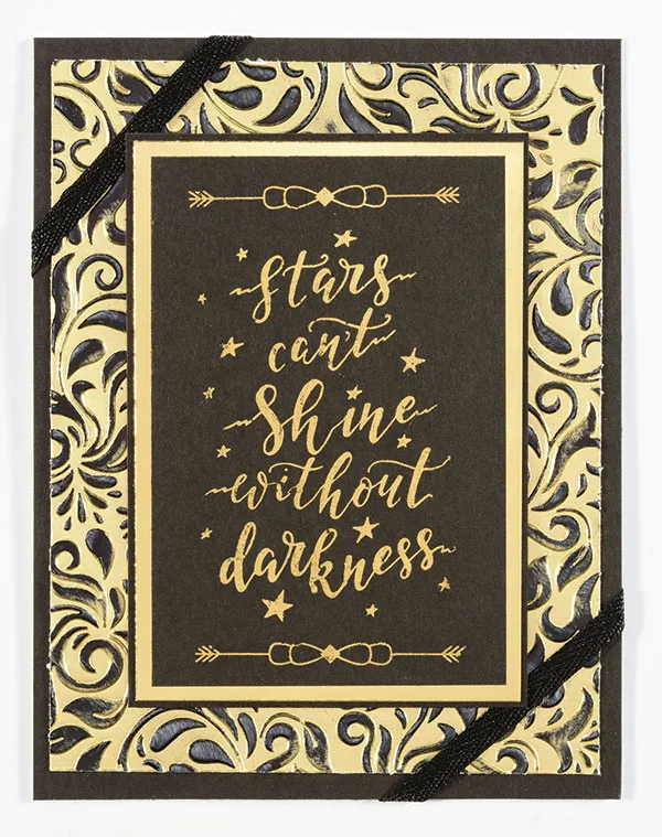 Card Inside: Rub the gold “Dream and stars” on a 3¼”x2” black cardstock. Mat on gold mirror cardstock with ¼” borders. Mat again on black cardstock with 1/16” borders. Glue centered.