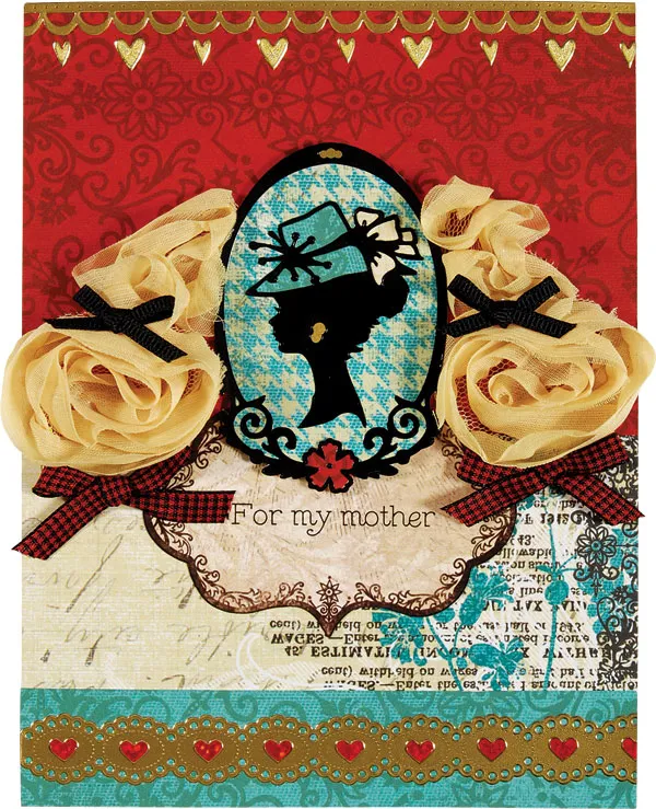Peel off the lady silhouette Dazzle™ and place just the hat on teal paper. Trim around. Back the bow with cream paper the same way. Cut a tiny piece of gold from the excess gold material on the gold Dazzles™ sheet and use it to back the earring. Glue the silhouette to teal/cream houndstooth paper. Peel off the oval frame and back the top detail with gold Dazzles™ material. Back the flower at the bottom with red patter. Place the frame around the lady silhouette and trim around. Foam tape the piece to the card centered, 1 1/4” from the top.