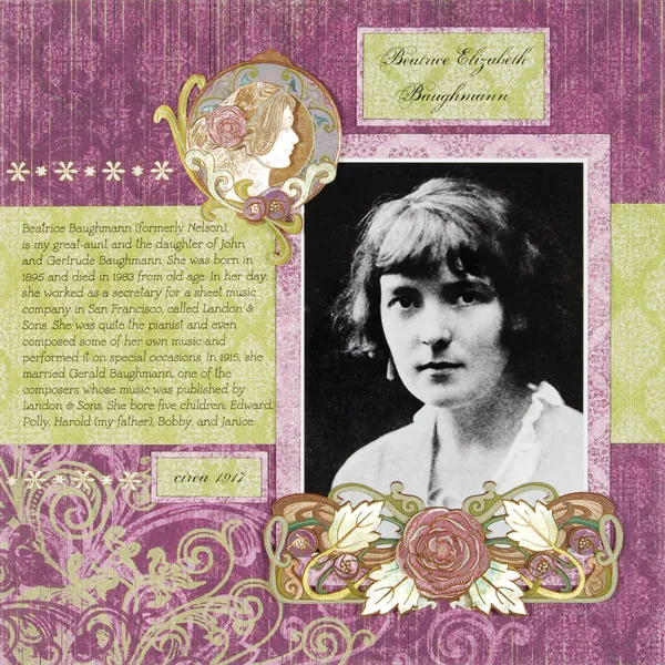 Assemble the silhouetted woman papier tole image according to the instructions on the sheet. Glue to the page at the top left corner of the photo as shown. Assemble the flower border and glue to the base of the photo.
