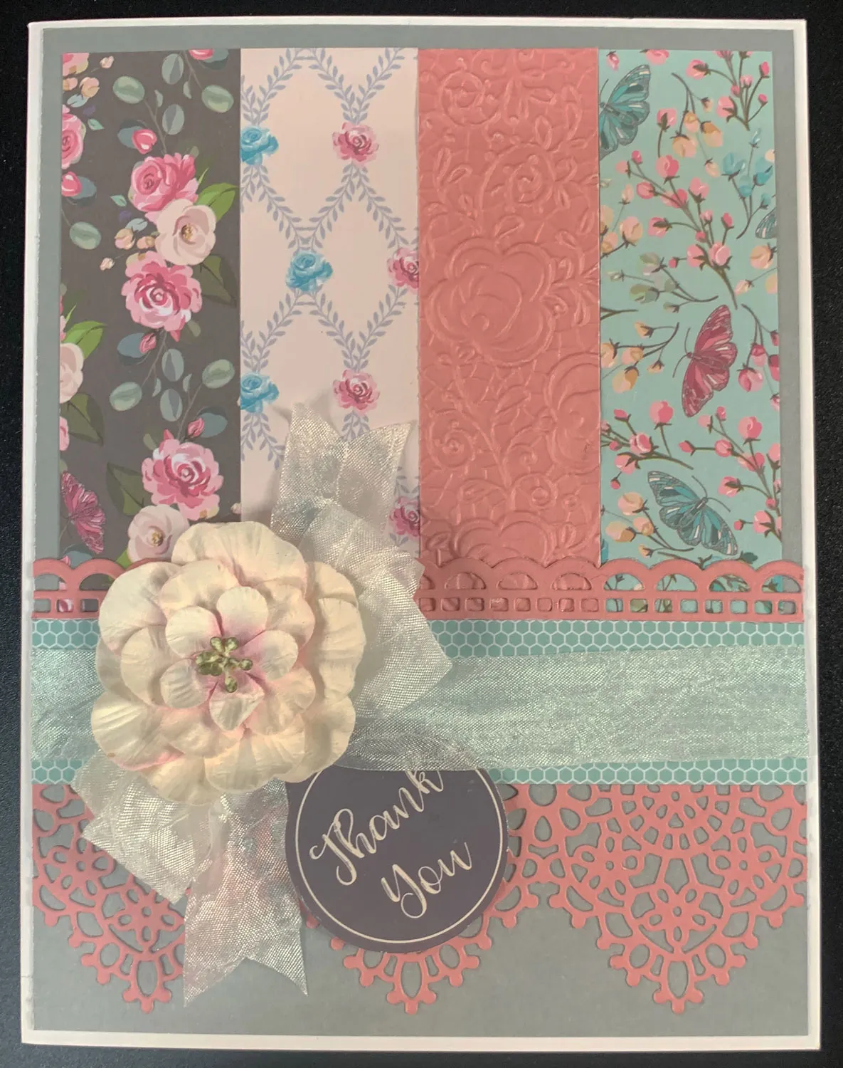 Cut three 1 1/8"x4" strips from the Beautiful Butterflies papers shown. Glue these and the embossed strip side by side across the upper portion of the gray cardstock panel, leaving 1/8" borders on the top and sides. Die cut the floral border from pink cardstock and use Sticky Specks to glue it across the panel, overlapping the bottom of the paper strips. Glue the panel centered on the card front.