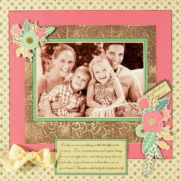 Use Emma’s Garden ivory/brown/teal/pink tiles paper as your background. Cut 10 3/4"x9 3/4" Emma’s Garden pink dots paper and ink the edges brown. Glue onto the background paper, centered 3/4" from the top.