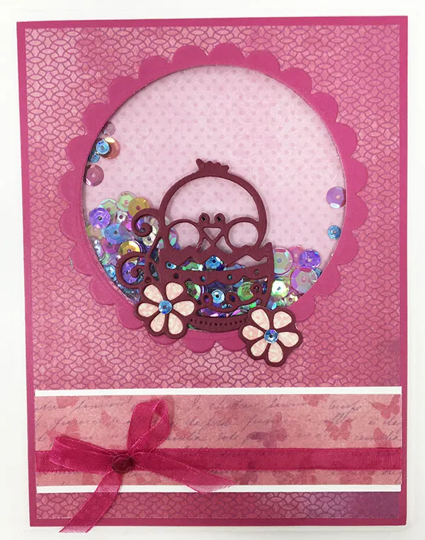 Place a tablespoon of sequins in the center of the pink dotted paper. Attach the front panel to the card front, centering it in place and capturing the sequins behind the window.