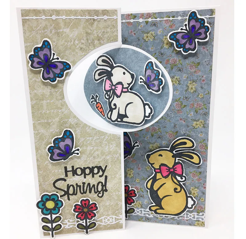 Stamp the three bunnies on the white cardstock. Stamp two full butterflies, two right-flying butterflies, and one left-flying butterfly on the cardstock. Stamp one carrot, three short flowers, and two tall flowers on the cardstock.