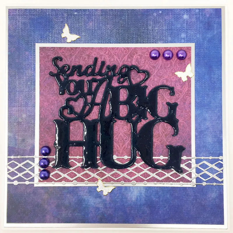 Cut three 3¼"x2¾" navy cardstocks, then attach each to double-sided adhesive, leaving the release paper on the backs. Die cut the Big Hug sentiment from each. Remove the release paper from one die-cut and attach it on top of a second die-cut. Repeat with the third die-cut, attaching it to the top of the first two.