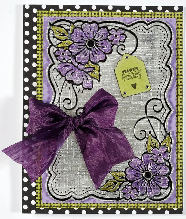 Stamp “Happy Anniversary” on Simply Susan green textured paper. Stamp a heart image below the words. Use the template to trace a Squared Tag B shape around the words and heart. Cut out the shape and ink the edges. Foam tape on the embossed piece as shown. Embellish the tag and embossed design with black Jewel Dazzles™. Use 1 1/2" wide purple crepe ribbon to tie a bow and Zot™ to the card as shown.