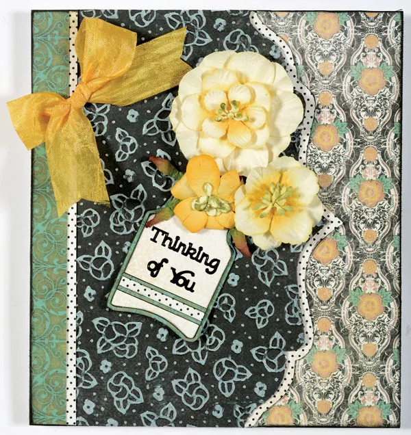 Arrange flowers and tag together on the embossed portion of the card front as shown. Glue the tag in place. Use 3/4" wide yellow crepe ribbon to tie a bow, trimming the ends into a “V”. Zot™ the bow on the left side of the card as shown.