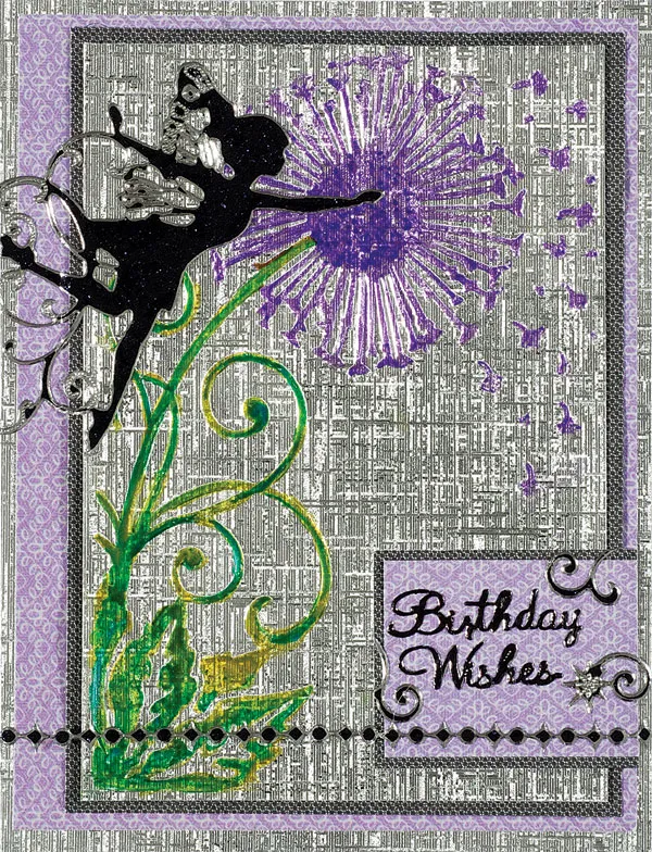 Cut 1 1/2"x2" Simply Susan lavender patterned paper. Mat on Simply Susan black patterned paper even with right side leaving a 1/8” border on all remaining sides. Place Fairy Dazzles™ sentiment “Birthday Wishes&rdquo,; and swirls on 2”x1 ½” Simply Susan lavender paper and mat on Simply Susan black patterned paper with a 1/8” border. Glue 5/8” from the bottom right. Place the Fairy Dazzles™ “fairy” on the top left corner as shown.