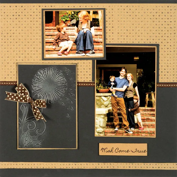 Journaling: Write or print “Wish Come True” onto Kraft cardstock and cut into 3 1/8”x3/4” strip. Ink the edges and foam tape below the large photo as shown.