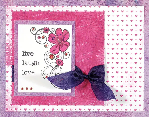 Cut a 4”x4” of Painted Flowers pink floral paper. Knot a 7” length of Painted Flowers purple crepe ribbon, and glue onto the pink paper, as shown. Glue to the left side of the embossed image with a 1/4” border.
