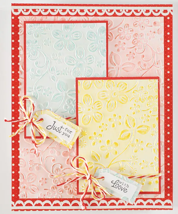 Cut two 14” lengths of twine, one red and one yellow. Thread together through the “Just for you” tag and tie at the bottom of the matted aqua piece. Foam tape 1/8” from the red embossed corner as shown, and foam tape the tag in place. Repeat for the “with Love” tag at the lower right corner.