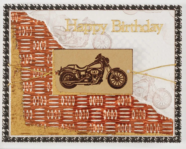 Stamp and emboss the motorcycle in brown on a 3”x1 3/4” kraft cardstock and ink the edges. Emboss the left and lower edges with Aged Gold enamel. Punch a hole at each end and thread a 5” length of memory thread through each hole. Twist thread once, foam tape the embossed motorcycle to the center of the acetate/ripple piece and tape the thread ends to the back.