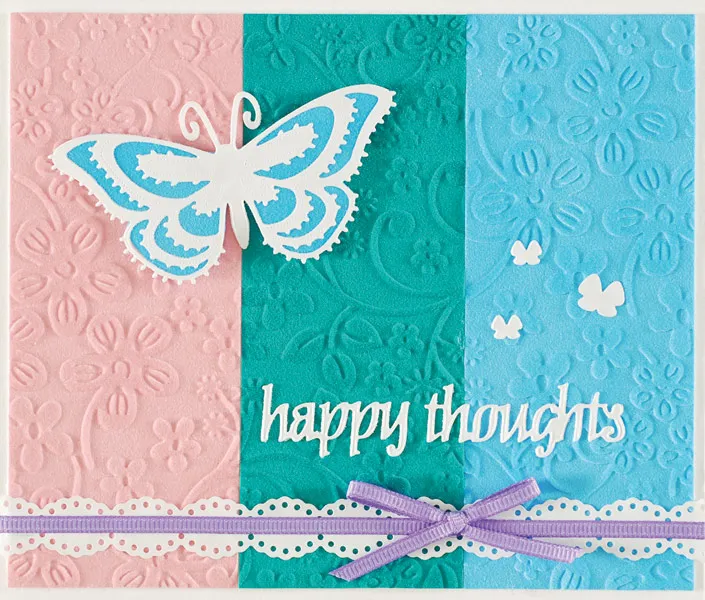 Place “happy thoughts” above the bow and 3 tiny butterfly Dazzles™. Back a large butterfly Dazzles™ with Powder Blue Suede and foam tape to the top left corner.