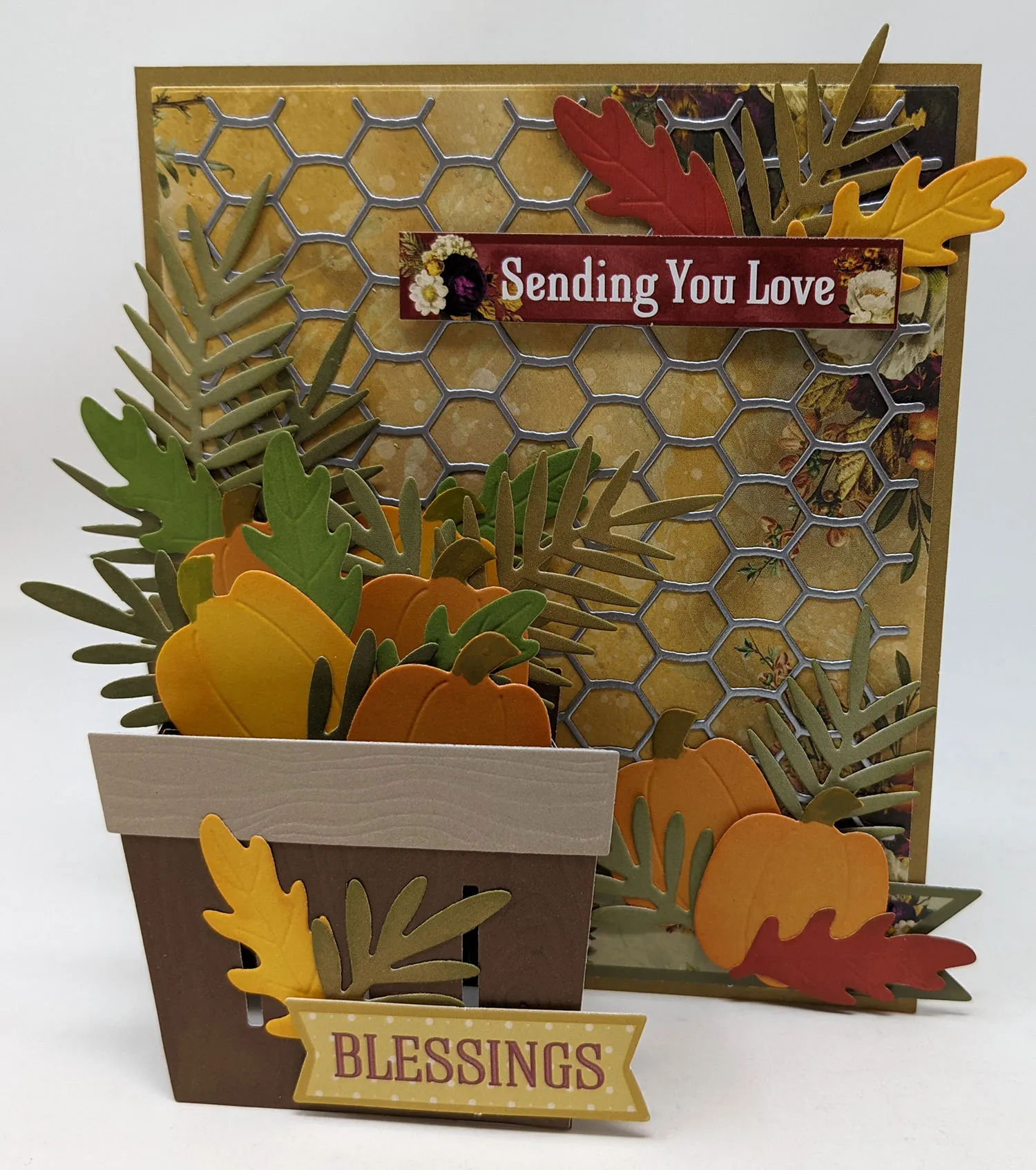 4. Glue leaf sprigs up the left side of the chicken wire cardstock as shown. Glue and foam tape three orange and two yellow pumpkins to the inside back and crossbars of the box with leaves and leaf sprigs around and extending from behind them. Following the die package directions, use sticky tape to secure the crossbars to the inside and the last two box edges together.
