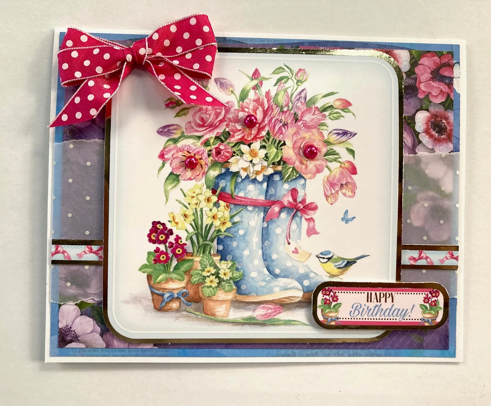 Tear the long edges of 6 1/2"x2 ½” dotted vellum. Score and fold ½ from either end, glue to the back of constructed piece. Glue to the card front leaving a 1/16" white border. Cut the bow border in half and glue to the vellum on each side 1 1/2" from the card bottom. Foam tape the boots focal Topper in the center over the border pieces. Foam tape the "Happy Birthday" Topper 1/2" from bottom right, place an extra piece of foam tape on the right end. Make and Zot™️ a 2" wide bow in the top left corner. Place pearls on flowers as shown.