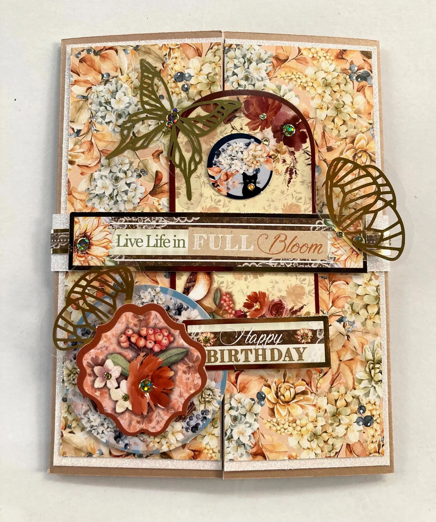 Belly band: Cut a 7/8"x11" strip of white glitter cardstock. Score at 3 1/2" and 8 1/2". Overlap the ends in the back with extra sticky tape. Use extra sticky tape to attach the Topper border around the band with a slight gap in the back. With extra sticky tape attach the "Live Life in Full Bloom" Topper in the center front of the band. With extra sticky tape attach the "Especially for You" Topper in the center back covering the gap. Place Dazzles™️ and attach the acetate butterfly as shown.
