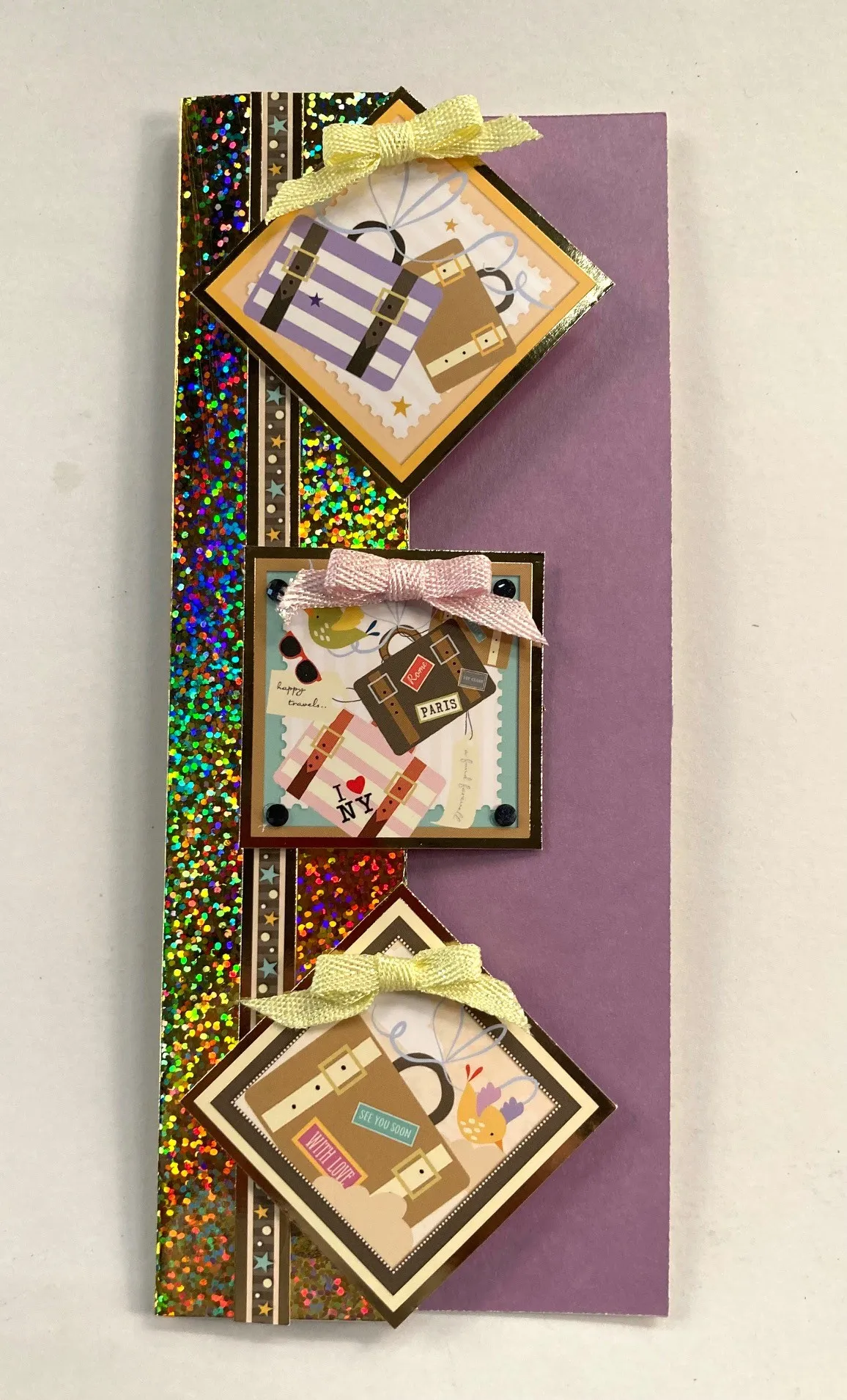 Cut 5"x8 1/2" gold holographic cardstock. Place vertically and score 1 ¾” from the left side. Cut the Topper border in half and tape ½” from the fold. Select three suitcase Toppers and foam tape along the center edge with the top and bottom on point and the center one covering the gap in the border. Make and Zot™️ a 1" wide bow at the top of each one. Place the dark blue Diamond Sparkles in the corners of the center image.