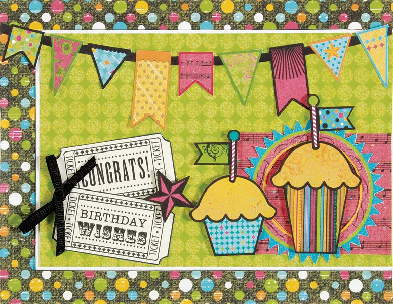 Glue the banner along the top of the green rectangle. Glue a 2 1/2” x 2” red music paper to the right edge of the card, 3/4” from the bottom. Glue the blue/red circle die cut over the rectangle and foam tape the large cupcake over the center with the small cupcake to the left.
