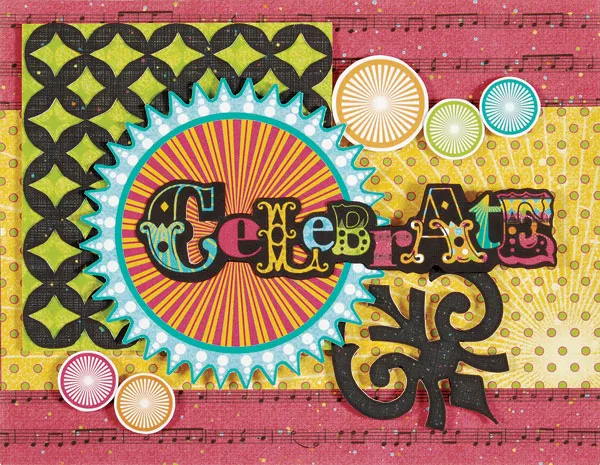 Glue the left side of “Celebrate” to the pink/yellow circle and foam tape the right side to the card (using 2 layers of foam tape). Foam tape the black spade-shaped embellishment under the right side of “Celebrate.”