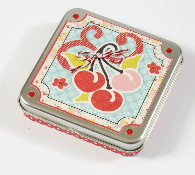 Punch out a 3” square from the die cuts. Glue to the top of the tin. Glue a red dot swirl to the top left corner. Glue a bunch of cherries overlapping the swirl.