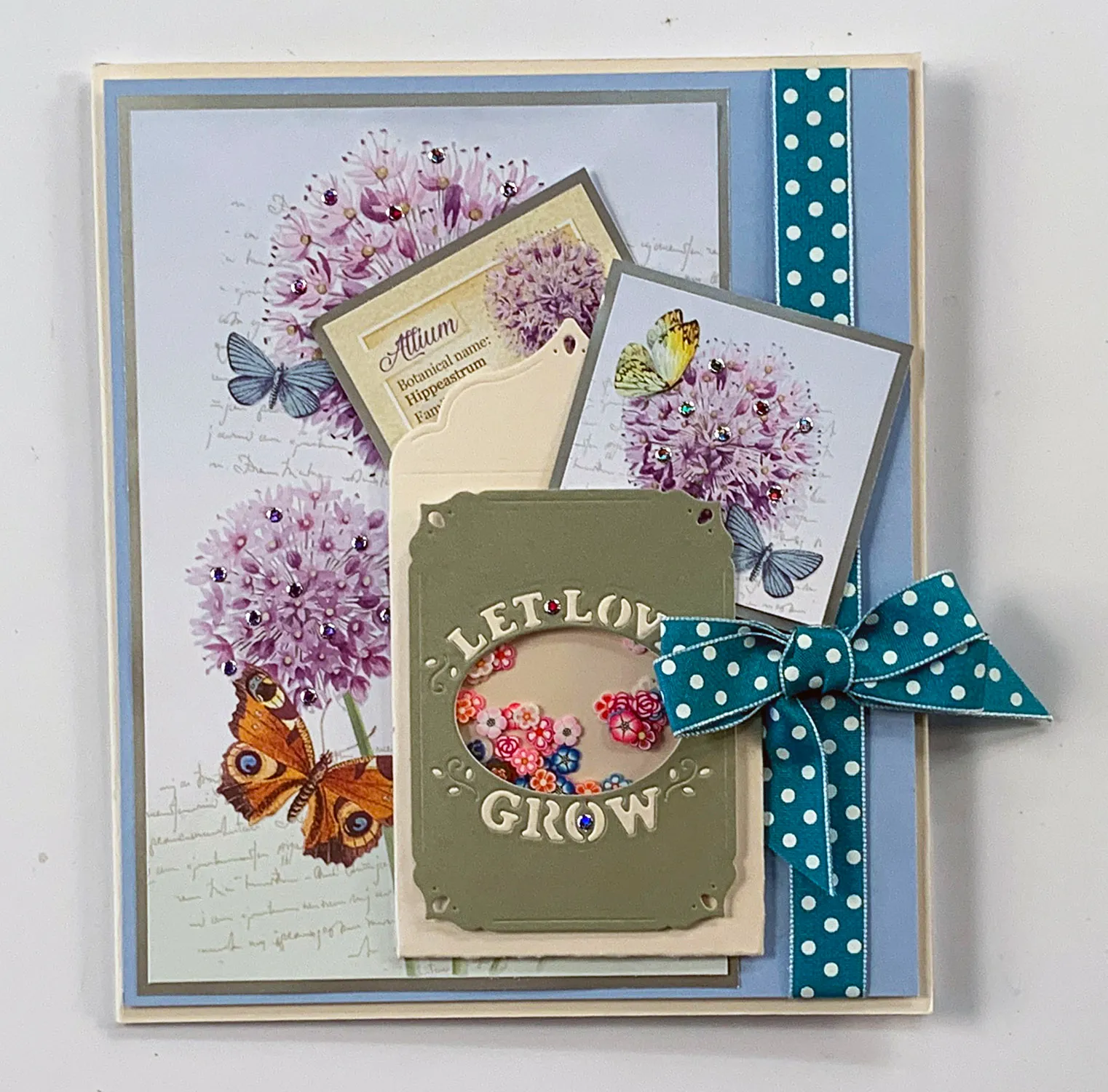 Cut out two square images from the same Allium page and mat on Silver specialty paper with 1/8” borders. Glue the seed packet shaker and matted squares as shown. Zot a dotted bow on the side. Place small purple Jewel Dazzles™ on the flowers and packet as shown.