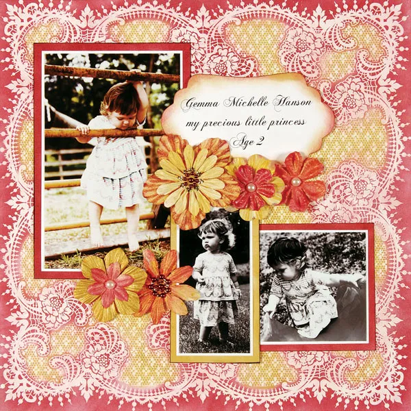 Spray a 2 ¼” daisy with Pink Sprinkles, then with Gold Glow. Add a brown crystal flower center and glue to the corner between the large photo and the narrow photo.