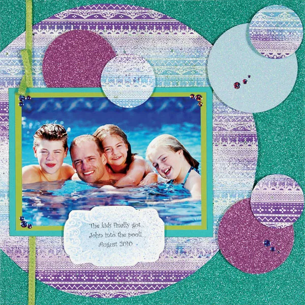 Mat a 5”x7” photo with lime and aqua cardstocks, leaving ¼” wide borders. Glue flush with the left side of the page. Place clusters of purple Jewels on each corner.