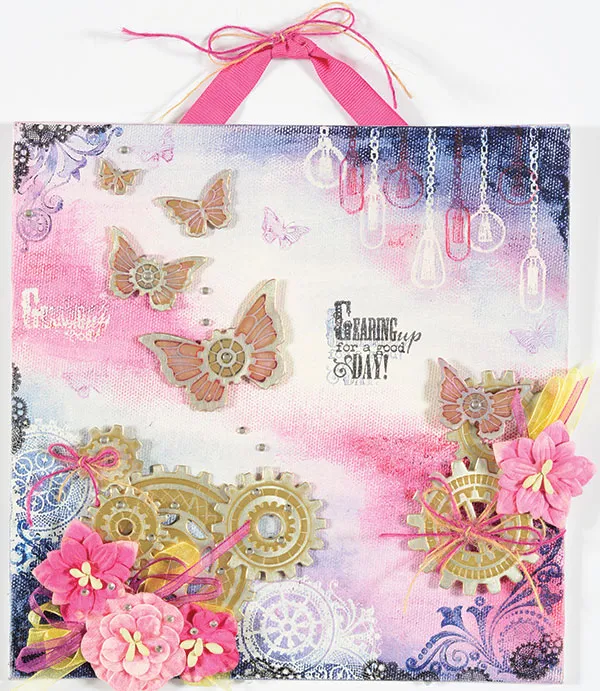 Scribble over the stamps with the crayons, then stamp more light bulbs in red, corner scrolls and “Gearing up…” in blue and tiny butterflies in purple, as shown. Stamp “Gearing up…” again in black, just offset from the blue stamped words. Stamp small gears in black around the edges of the canvas.