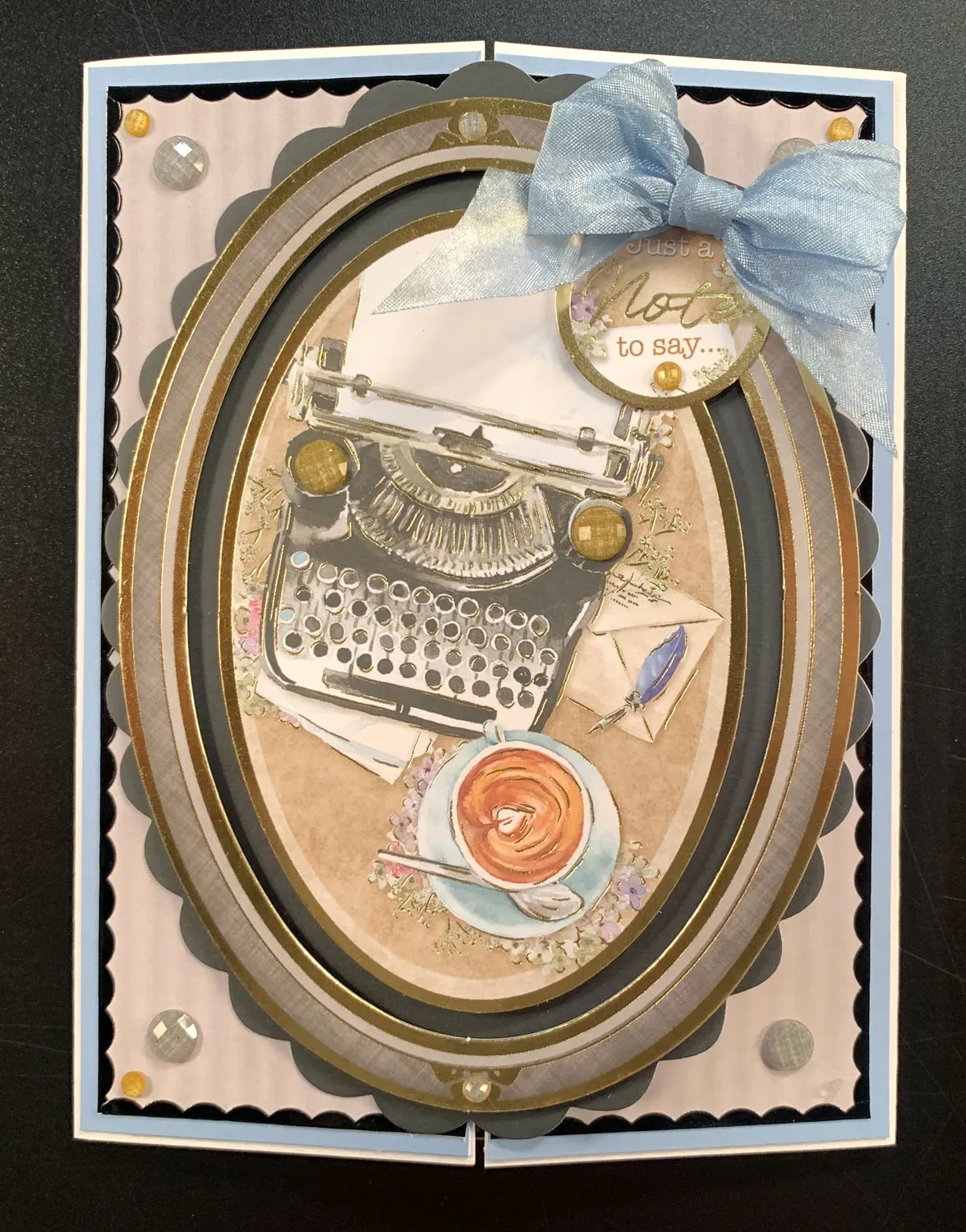 Die cut the largest oval from black cardstock. Foam tape the typewriter oval die-cut to this piece leaving out the middle frame. Glue ONLY to the left gate. Place small gold gemstones in each corner and a large silver next to each one. Glue the small circle sentiment die-cut to the top right with a small gold gemstone at the bottom. Zot™ 2” wide bow as shown. Add 2 gemstones to the typewriter.