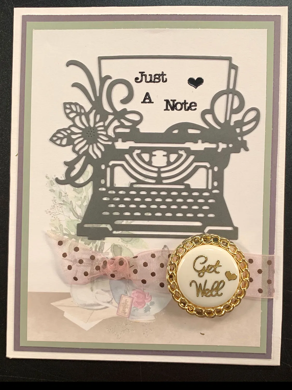 Cut 4 1/4”x 5 5/8” teacup insert and mat on olive Mat-tastic with 1/8” borders. Mat again on plum Mat-tastic with 1/8” borders. Knot one end of 5” ribbon and Zot™ the knot 1 ½” from the left edge. Glue the end to the back and glue to the card front. Select a large button and add gold “Get Well” Dazzles™. Die cut the typewriter die from black Mat-tastic cardstock and glue 1/2” above the ribbon. Zot™ the button onto the ribbon. Place Tiny Words Dazzles™ in the typewriter “paper.”