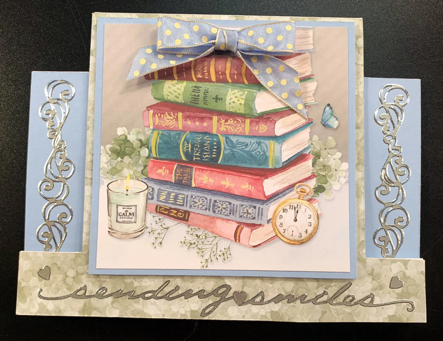 Place the card front face down on the back of the 8x8 stacked books paper. Spread glue over the area and position the paper; trim the excess. Repeat for each side panel using light blue Mat-tastic cardstock. Place Fancy Border Dazzles ™ along each side panel. Cut the book stack to 4” square and mat on blue Mat-tastic with 1/8” borders. Foam tape to the card center. Place Script Dazzles™ below and Zot™ a 2” wide bow at the top.