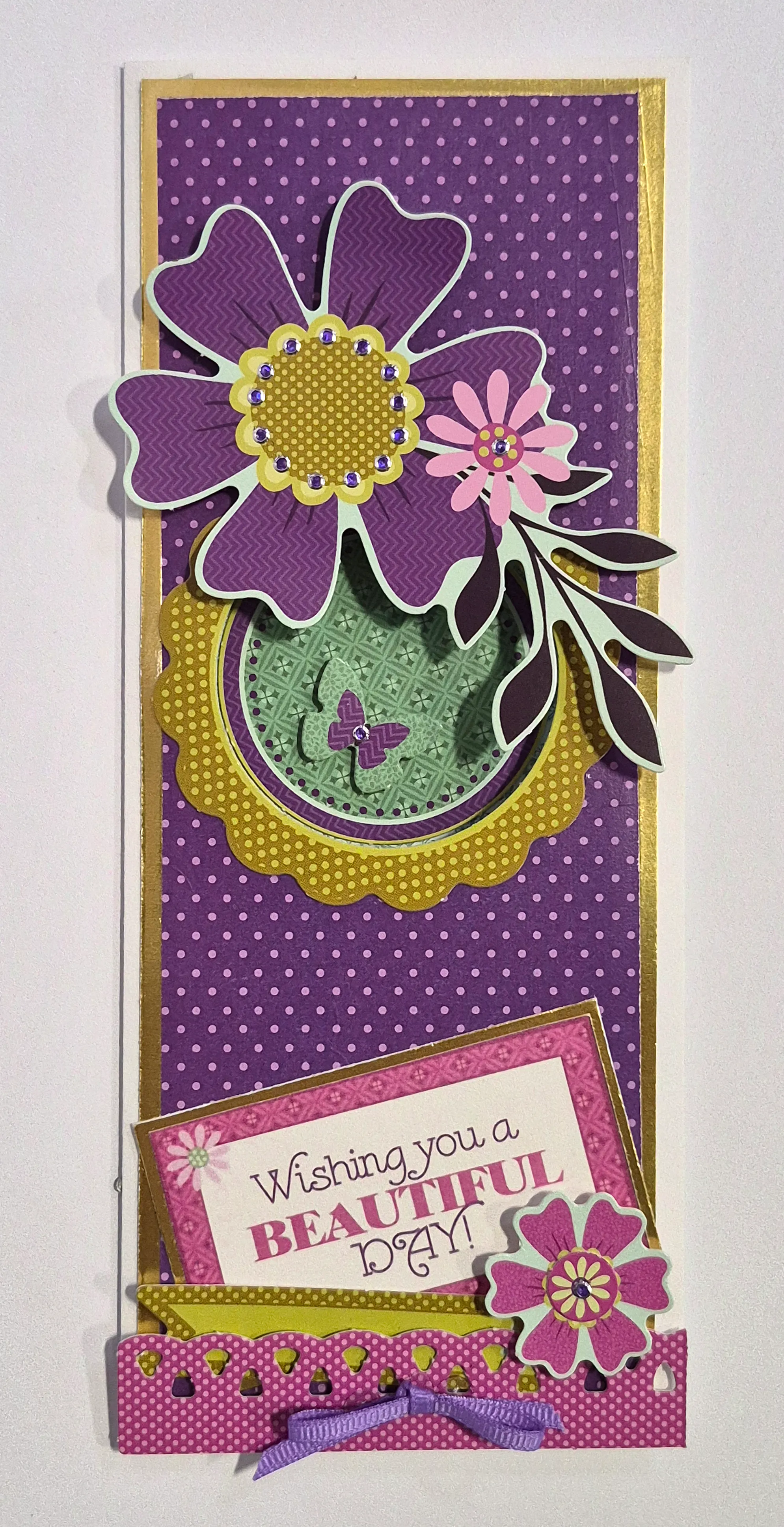 Cut out “Wishing You a Beautiful Day” and mat on gold cardstock leaving 1/16” borders. Glue into the border at an angle as shown. Tape the bottom of the yellow banner die-cut bowing the end a little into the border. With a double layer of foam tape, secure the flower die-cut over the right edge of the border. Glue a pink circle in the center. Place tiny purple Dazzles™️ in the flower centers. Make and Zot™️ a 2” wide purple bow from the 1/8” Ribbon Set and place centered on the border die-cut.