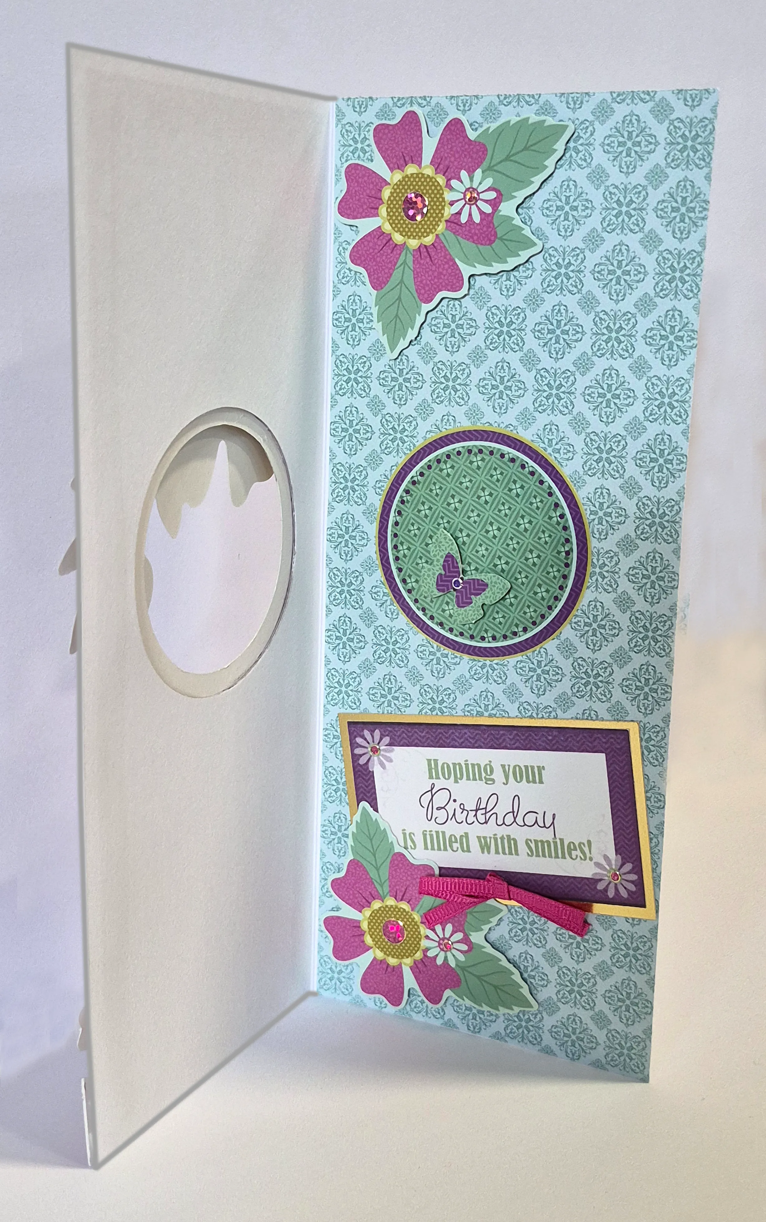 Card inside: Cover the inside with teal Beautiful Day paper. Foam tape flower die-cuts to top left and bottom left corners. Mat “Hoping Your Birthday Is Filled with Smiles” on gold cardstock with 1/16” borders. Glue behind the bottom flower at an angle. Make and Zot™️ a 2” wide pink bow from the 1/8” Ribbon Set and place centered at the bottom of the cut out. Close the card and glue the circle die-cut so it shows when the card is closed. Foam tape the butterfly die-cut as shown. Place Dazzles™️ in the flower and butterfly centers.