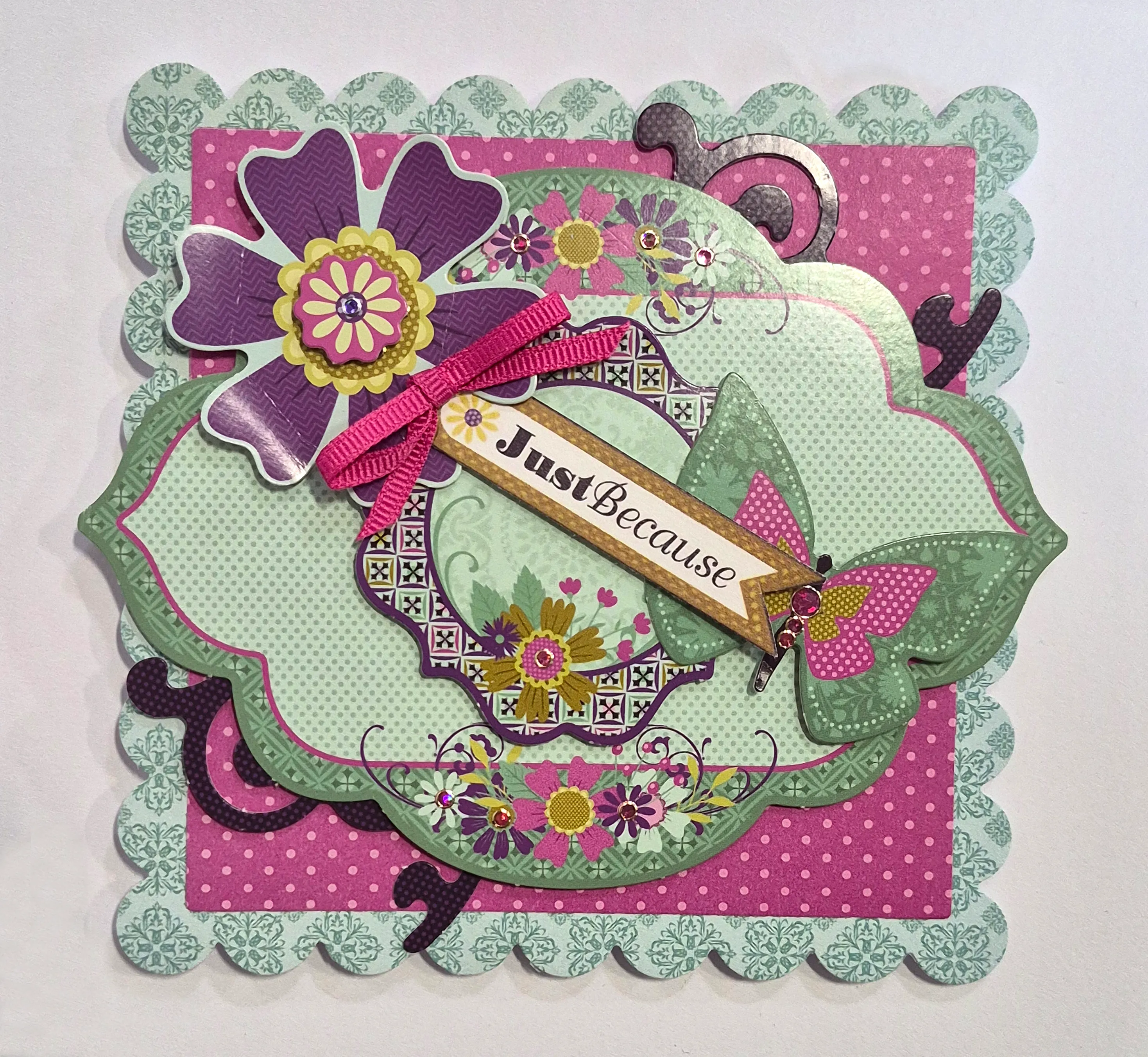 Foam tape the large ornate die-cut in the center. Foam tape smaller ornate die-cut in the center. Foam tape a purple flower to the upper left corner with a pink small circle die-cut in the middle. Cut out and foam tape “Just Because” tag into the flower petals. Foam tape the butterfly die-cut on the left and place on the lower right corner.