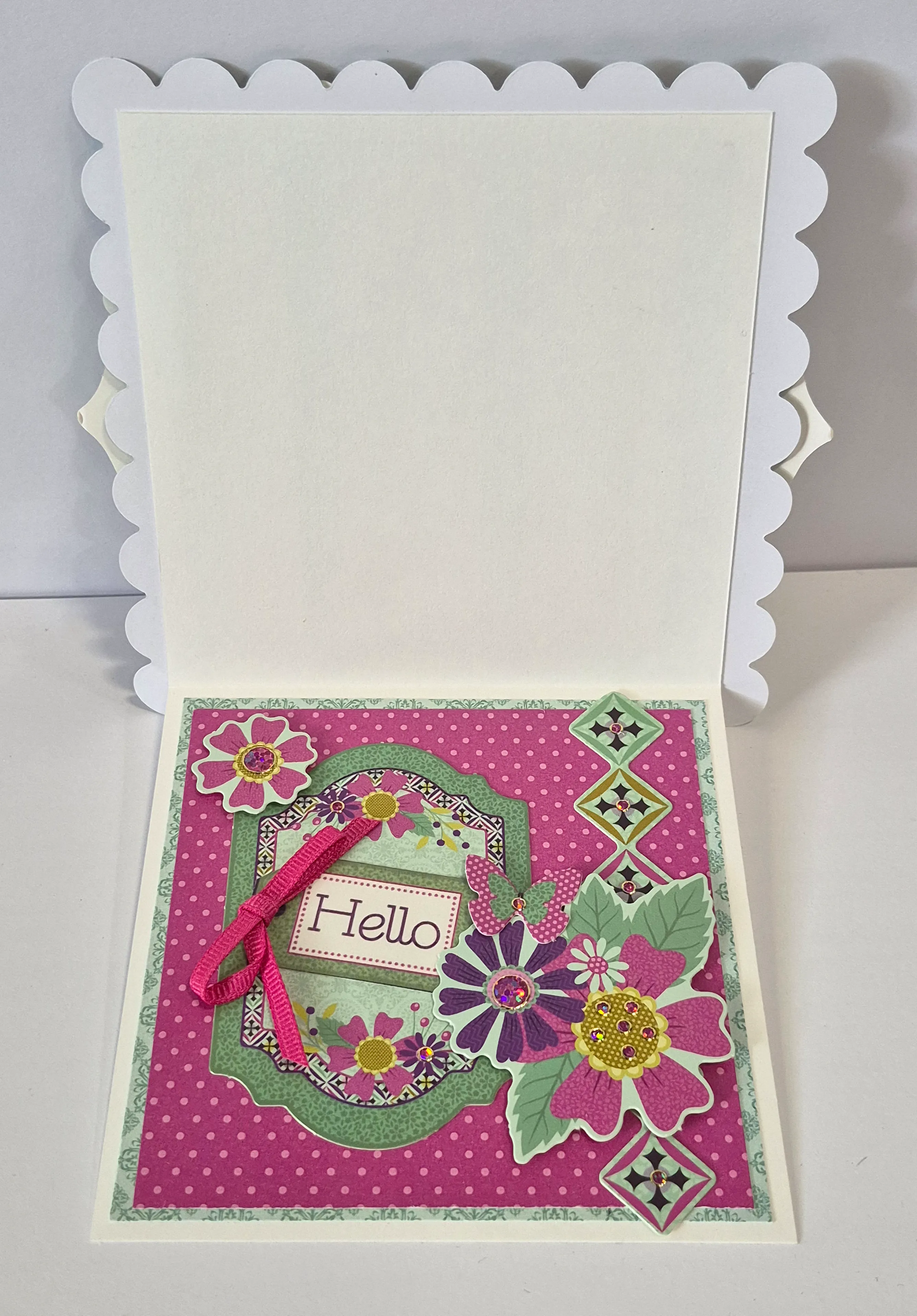Card inside: Cut 3 3/4” square pink dots paper and mat on green tile paper leaving 1/8” borders. Tape green die-cut 5/8” from the left side. Tape “Hello” cutout at a slight angle in the center. Make and Zot™️ a 2” wide pink bow from the 1/8” Ribbon Set and place on the top of “Hello.” Tape diamond border die-cut 1/2” from the right. Foam tape flowers die-cut in bottom right corner and foam tape single pink flower in the top left corner. Place pink jewel Dazzles™️ in the flower and diamond centers.