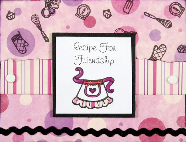Computer journal “Recipe for Friendship” on white cardstock. Cut into 2 3/4” square and stamp an apron below the words. Stamp the apron on stripe paper and cut out the ruffle. Glue to the stamped white image. Color the apron details and mat on black cardstock, leaving a 1/8” wide border. Glue over the card fold.