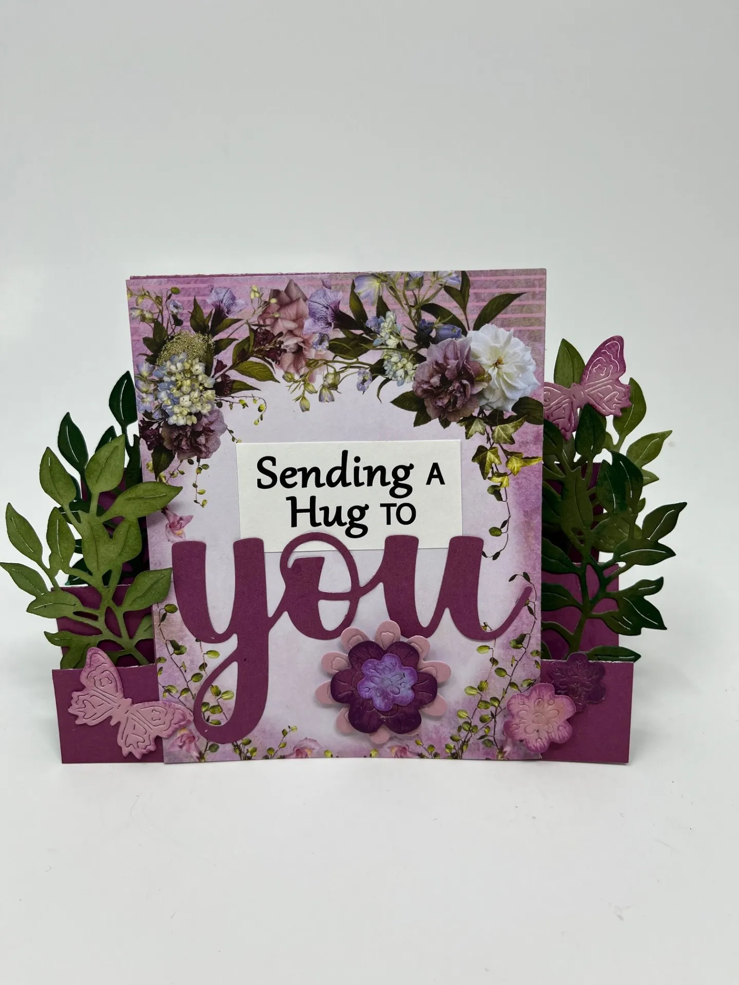 4. Use the script you with the purple Solid and run through the Gemini. Glue to the center of the card. Remove white “Sending a Hug to” and glue it tucked above the you. Foam tape the flowers at the bottom of the large cutout. Glue the leaf sprays to each step of the card. Glue a butterfly at the bottom left and top right.
