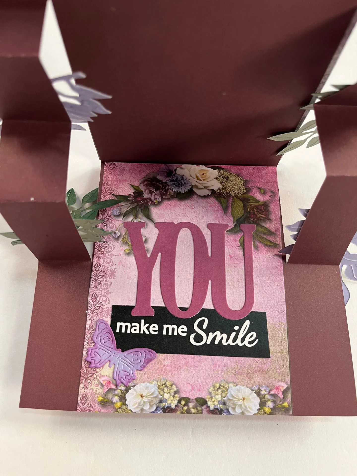 5. Inside: Remove the large cutout shown from the Whispering Florals Patterned. Trim to fit and glue in place. Use the YOU die with purple Solid and run through the Gemini. Glue in the center with a black “make me Smile” cutout tucked under the YOU. Make and ink another butterfly and glue at the lower left.