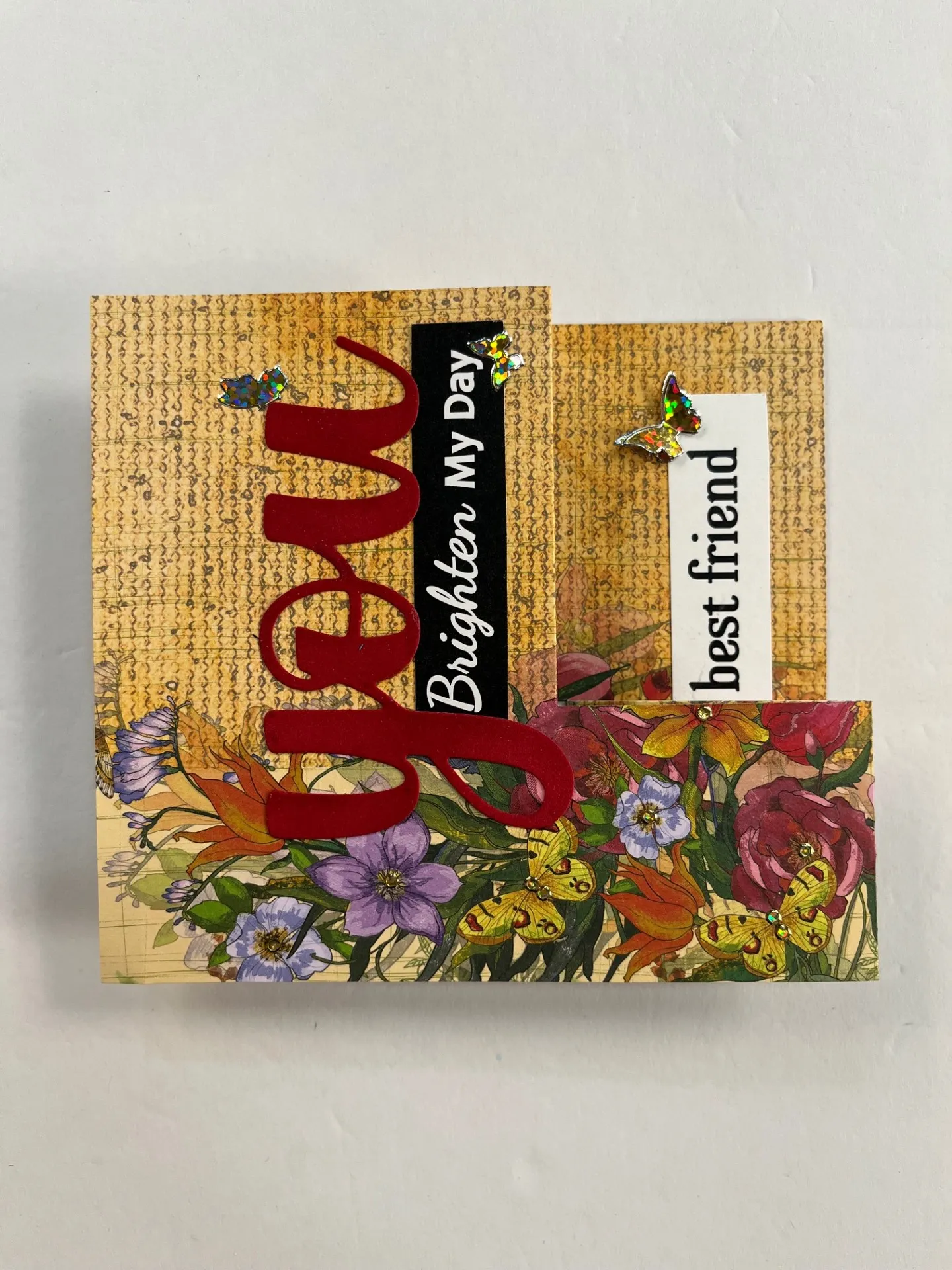 2. Turn the yellow tri fold card vertically. Select the script you and die cut it out of the red suede paper. Glue to the card as shown. Cut out the black “Brighten my day” piece and glue under the you.