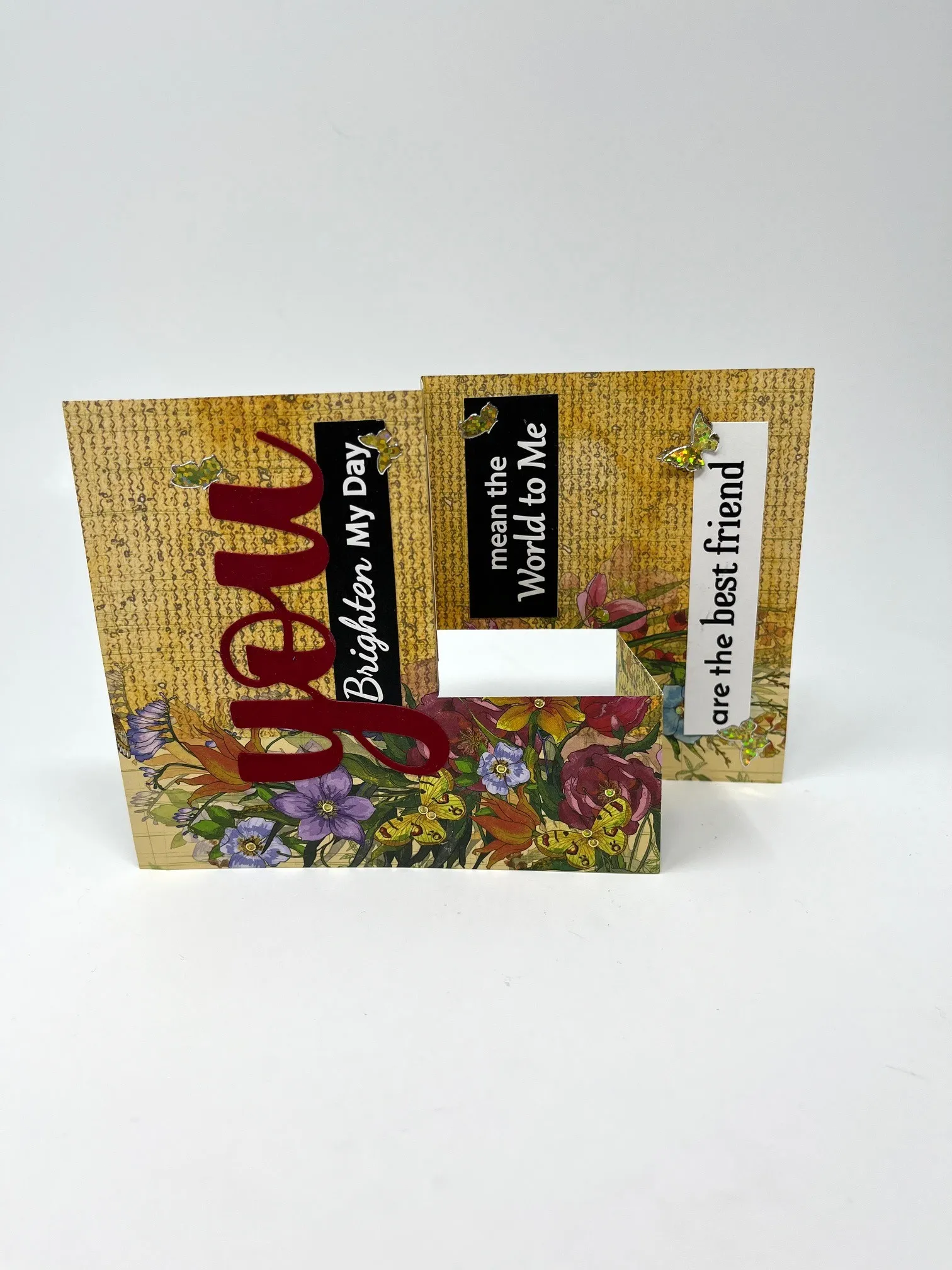 1. Select the yellow with border Flower Queen 12x12 Patterned Cardstock. Use low tack tape to position the Tri Fold Surprise die in place and run through the Gemini or other die cutting machine. Be careful the border will be along the bottom of the cut piece. Fold following directions on the package.