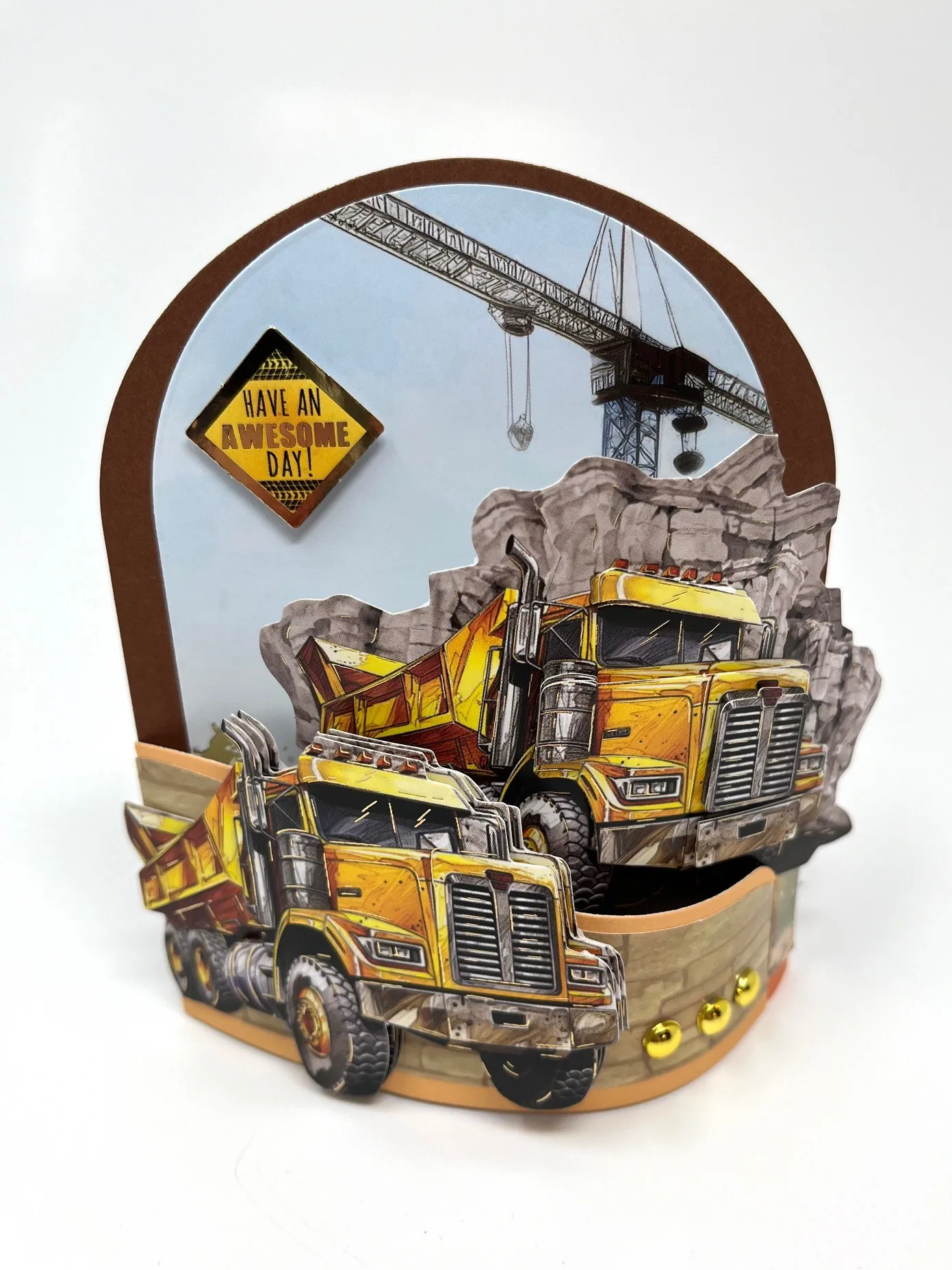 Die cut the center layer out of dark orange Solid cardstock. Die cut the rock area of the same paper pad page and remove 1/8" off the bottom leaving a 1/8" orange border and secure with mono adhesive. The slit should still match up but go over it again with the retractable blade. Secure the largest truck to the top of this layer with extra sticky tape along only the bottom of the truck base. Avoid the slit when placing the truck. Secure to the back of the base layer with extra sticky tape.