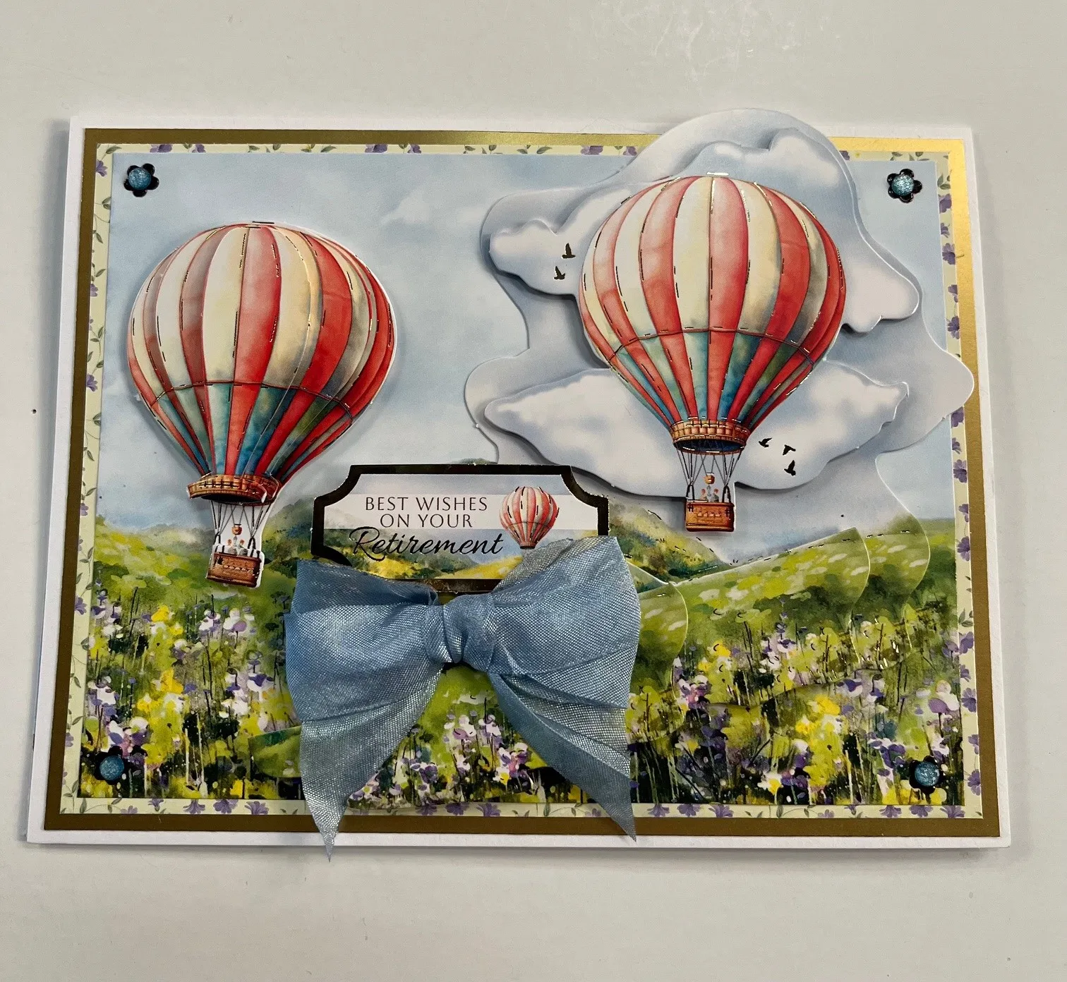 Use the two largest hot air balloons separately. Construct the balloons and landscape pieces with foam tape and place on the card front as shown. Foam tape "Best Wishes on Your Retirement" Topper sentiment between the balloons as shown. Make and Zot™️ a 2" blue bow below it. Place the little flowers from the script Dazzles™️ in each corner and place a small Diamond Sparkles in the centers.