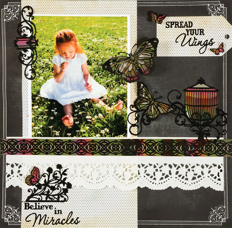 Page Background: Place Chalkboard black with white border paper in front of you. Glue 6”x12”Chalkboard black dot paper 1 1/8” from the left side. Cut 3¾"x2” Chalkboard black dot paper. Punch a hole on the right side and cut the corners from right edge as shown. Glue even with the right and 7/8” from the top. Place Enchanted Moment ”Spread your Wings” sentiment onto the paper as shown.