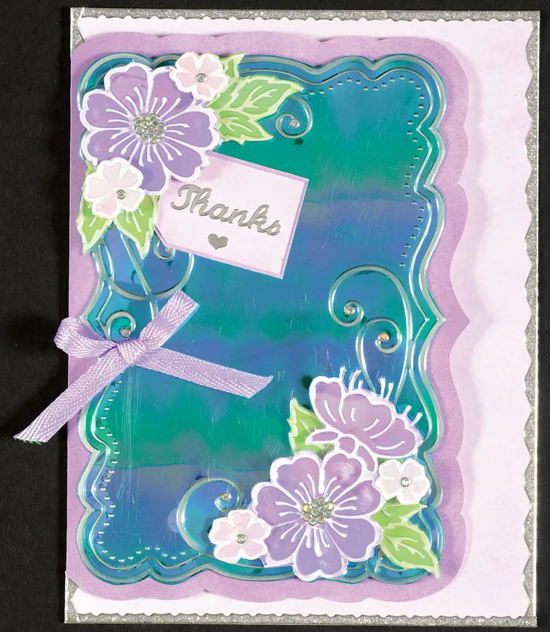 Cut small pieces of the lavender Shimmer Sheetz (from the Iris Gemstone Sampler) large enough to cover each of the large flower images on the embossing folder. Place over the large flowers inside the folder and run it through your machine. Remove from the folder and sand the surface of the embossed images. Repeat with green Shimmer Sheetz for the leaves, and pink for the small flowers (all colors from the Iris Gemstone Sampler). Sand the surface of all the images.